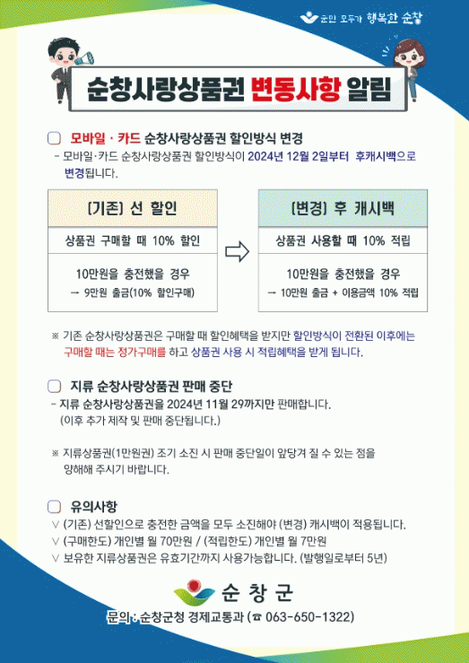 다만, 지난 12월 군에서 발표한 바와 같이 지류 상품권(1만 원권)은 이미 판매가 중단되어 더 이상 구매할 수 없으며, 현재는 모바일·카드 상품권만 구입 가능하다.