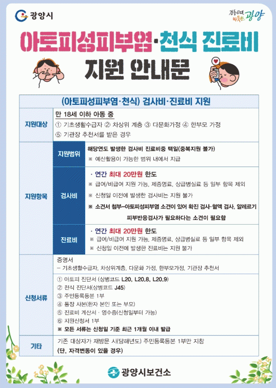 지원 대상은 광양시에 거주하고 아토피피부염(L20), 천식(J45)으로 진단받은 만 18세 이하의 취약계층(기초생활수급권자, 차상위 의료급여, 다문화가정, 한부모가정) 환아다.