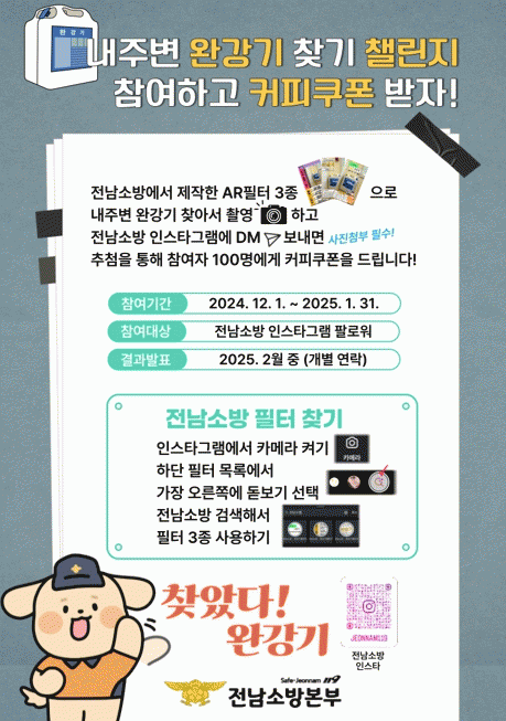 이벤트에는 군민 누구나 참여할 수 있다. 인스타그램에서 카메라를 실행한 후 ‘전남소방’ 필터를 검색해 주변 완강기를 촬영하고 사용 방법을 확인한 뒤 이를 전남소방 공식 계정으로 DM(다이렉트 메시지)을 보내면 된다.