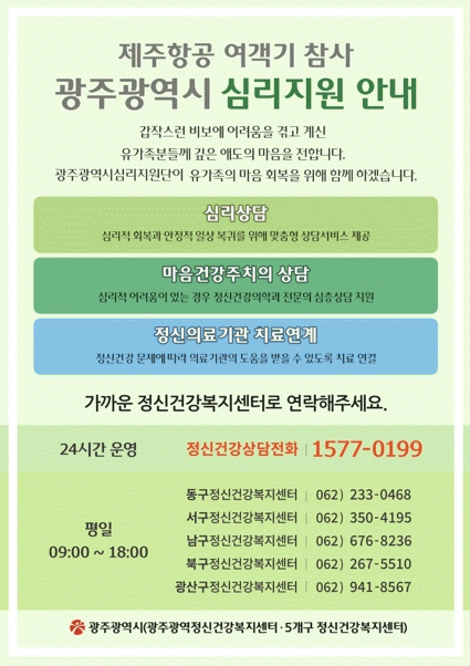 정영화 복지건강국장은 “참사로 유가족은 물론 시민들도 심리적 충격으로 불면·불안·절망감·무기력 등 아픔을 호소하고 있다”며 “심리적 어려움으로 도움이 필요한 시민들은 주저하지 말고 24시간 정신건강 상담전화를 이용해 주길 바란다”고 밝혔다.