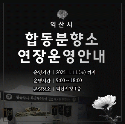 익산시는 시청 1층에 마련된 '항공 참사 합동분향소'를 오는 11일 오후 6시까지 일주일 연장 운영하기로 했다고 4일 밝혔다.