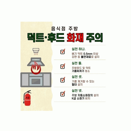 세 번째로, 덕트와 후드에는 기름을 효과적으로 걸러낼 수 있는 필터를 설치해야 한다. 필터는 화재 예방뿐 아니라 덕트 내부의 청결 유지에도 도움을 준다. 마지막으로, 주방에는 반드시 주방용 자동소화장치와 K급 소화기를 비치해야 한다. K급 소화기는 기름 화재에 특화된 소화기로, 화재 초기 진압에 매우 효과적이다.