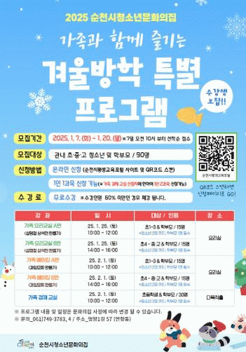 순천시 청소년문화의집 관계자는 “겨울방학 동안 가족과 청소년이 함께 배우고 소통하며, 유대감을 강화할 수 있는 소중한 시간이 될 것으로 기대된다”며, “앞으로도 청소년과 가족의 성장을 지원하는 다양한 프로그램을 운영할 계획이다”고 밝혔다.