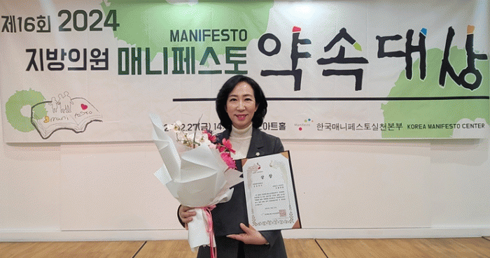 한국매니페스토실천본부에서는 지방의회 역량 강화 및 주민들의 신뢰를 쌓기 위해 매년 전국의 지방의원을 대상으로 ‘공약 이행’ 부문과 ‘좋은 조례’ 부문으로 나눠 수상자를 선정하고 있다.