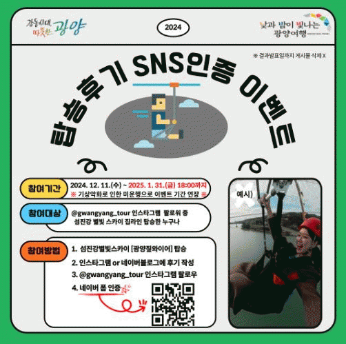 한편, 광양 짚와이어 ‘섬진강 별빛 스카이’ 개장 기념 탑승 후기 SNS 이벤트가 기상 악화에 따른 미운행 발생으로 이달 말까지 연장된다.