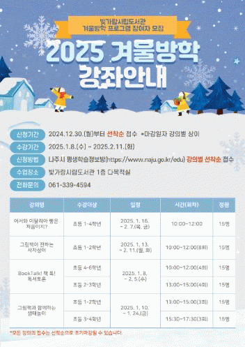 나주시 관계자는 “이번 겨울방학 프로그램은 아이들이 책과 연계된 다양한 체험을 통해 의미 있는 시간을 보낼 수 있도록 기획됐다”며 “책과 함께하는 배움과 놀이가 어린이들에게 따뜻한 겨울방학의 추억을 만들어 주길 바란다”고 밝혔다.