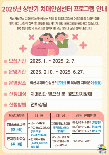 익산시 치매안심센터는 경도인지장애와 치매진단자를 대상으로 '기억의 봄' 프로그램 참여자를 모집한다고 7일 밝혔다.