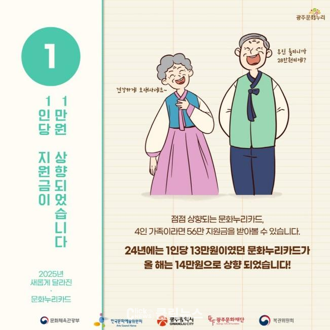 6세 이상 기초생활수급자 및 차상위계층에게 문화예술·여행·체육 활동 등을 지원해주는 문화누리카드는 올해 1만원 인상되어 1인당 14만원이 지원되며, 수급자격이 유지될 경우 별도의 신청 절차 없이 자동 재충전된다.