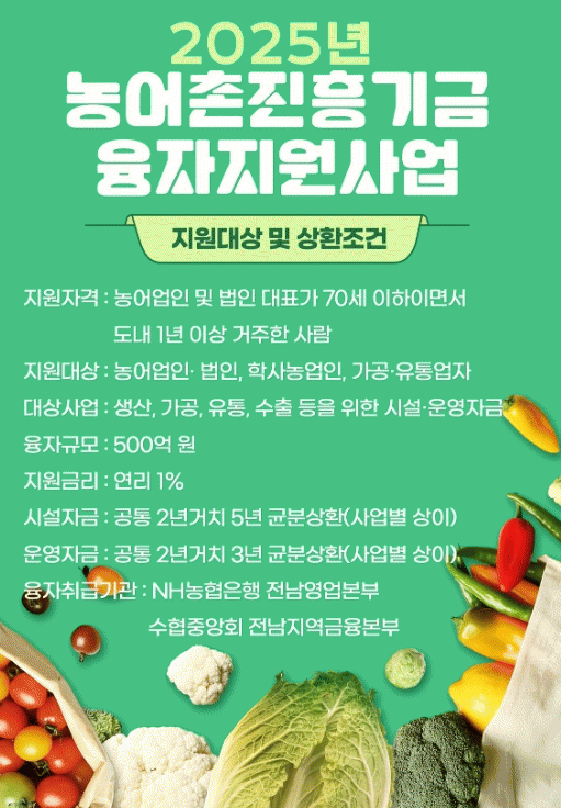 지원 대상은 전남에 주소를 둔 농어업인이나 전남에 주된 사무소를 둔 농어업법인이다.