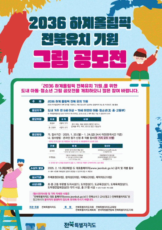 이정석 2036 하계올림픽 유치 TF 본부장은 “이번 공모전은 단순한 그림 대회를 넘어, 전북 미래세대의 꿈과 희망을 공유하고, 올림픽 유치에 대한 도민들의 관심과 지지를 끌어올리는 중요한 계기가 될 것”이라며, “도내 아동·청소년들이 창의적이고 의미 있는 작품으로 공모전에 적극 참여해 주길 바란다”고 말했다.