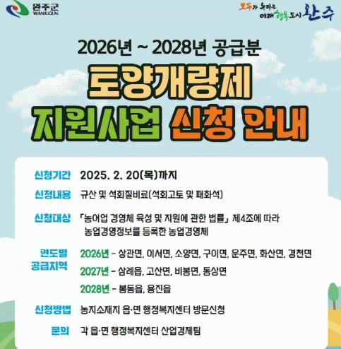 신청한 토양개량제는 선정심사를 거쳐 ▲2026년 상관면, 이서면, 소양면, 구이면, 운주면, 화산면, 경천면 ▲2027년 삼례읍, 고산면, 비봉면, 동상면 ▲2028년 봉동읍, 용진읍에 순차적으로 공급된다.