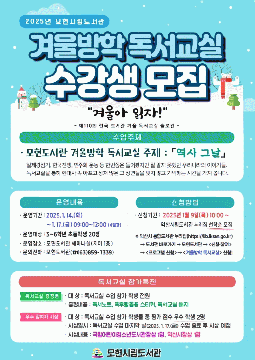 독서교실 참여 신청은 익산시 통합도서관 누리집에서 가능하며 영등·모현·부송·유천도서관은 9일, 금마·황등도서관은 23일부터 선착순으로 모집한다.