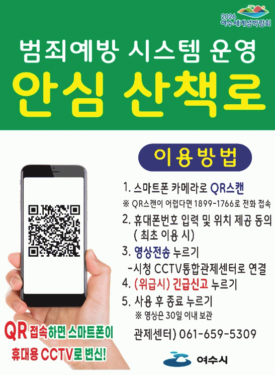 전남 최초로 구현되는 ‘산책로 범죄예방시스템’은 개인 스마트폰을 이동형 CCTV로 활용하는 기술로, 위급상황 발생 시 여수시 CCTV통합관제센터(이하 관제센터)와 연계돼 빠른 대처가 가능하다.