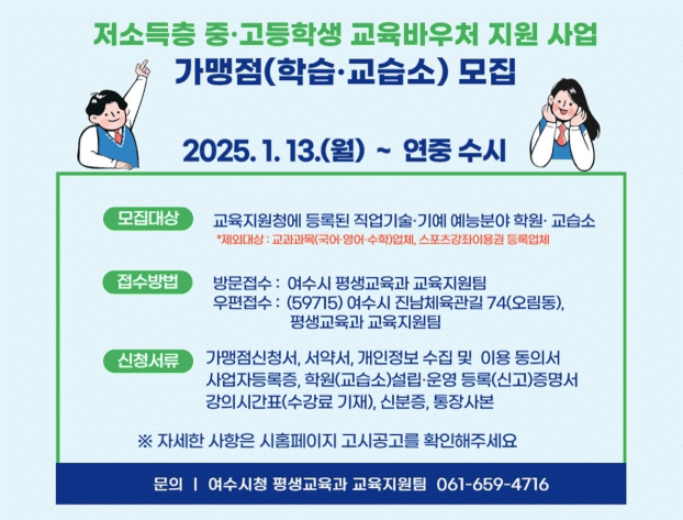 기타 자세한 사항은 여수시 누리집 공고문을 확인하거나 평생교육과 교육지원팀으로 문의하면 된다.