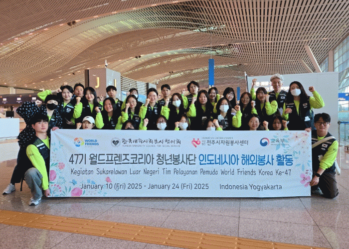 전국 각 지역 대학생 26명과 인솔자 3명 총 29명의 단원으로 구성된 제47기 WFK 청년봉사단 인도네시아팀은 인도네시아 족자카르타 세원(sewon)지역 팀블하르죠 초등학교 3~5학년 학생 100여명을 대상으로 봉사활동을 전개한다.