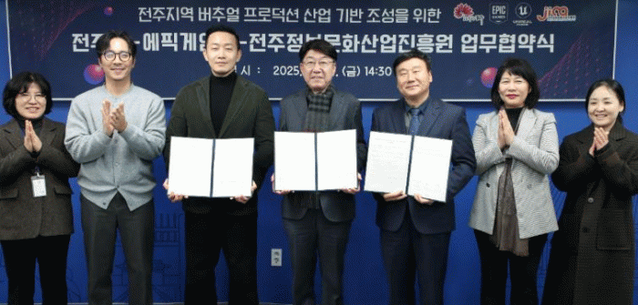전주시와 에픽게임즈는 10일 시청 3층 회의실에서 우범기 시장과 에픽게임즈 코리아 박성철 대표, 전주정보문화산업진흥원 허전 원장 등이 참석한 가운데 전주지역의 버추얼 프로덕션 산업 기반 조성 및 전문인력 양성을 위한 업무협약(MOU)을 체결했다.