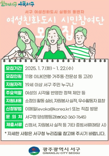모집인원은 11명 이내로 여성친화, 양성평등 정책에 대한 관심이 많은 서구 주민 누구나 가능하며 신청서를 작성해 서구청 양성평등과로 방문하거나 이메일로 제출하면 된다.