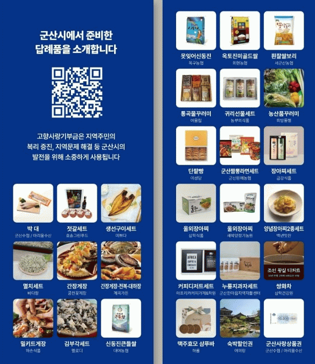현재 군산시 대표 답례품으로는 쌀, 보리, 농산물꾸러미, 박대, 꽃게장, 장아찌 등으로 19개 품목 28개 업체가 참여하고 있다.