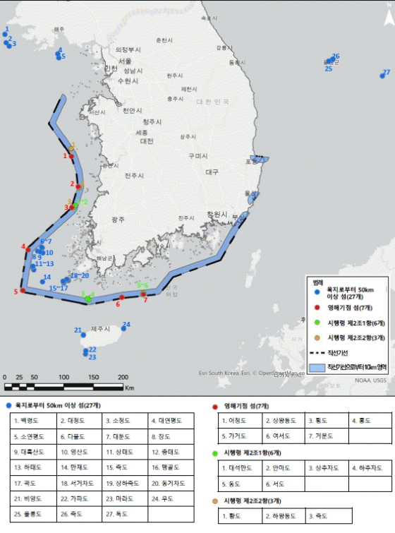 전국 43개 중 전남은 25개 섬이 해당된다. 시군별로 여수 3, 영광 4, 완도 1, 진도 6, 신안 11곳이다.