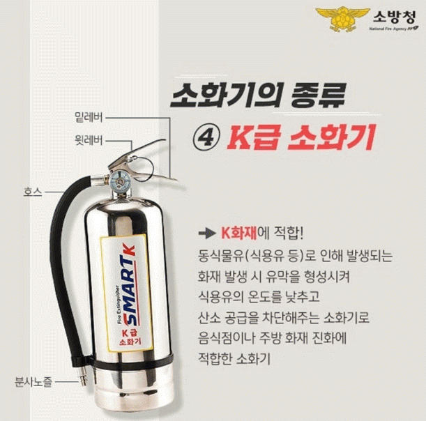 K급 소화기는 주방 화재, 특히 식용유나 유지 화재를 진압하는 데 특화된 소화기로, 고온의 식용유에 물을 사용할 때 발생할 수 있는 위험한 재발화를 방지하며, 기름 표면을 덮어 산소 공급을 차단하는 특수 소화약제를 사용합니다.