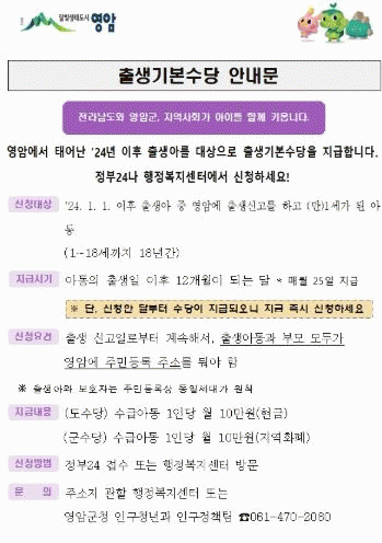 전라남도와 영암군의 출생기본수당은 소득 수준과 관계없이 2024년 이후 출생해 전남에 출생신고를 하고 영암군에 주소를 둔 1세 아동에게 지급된다.