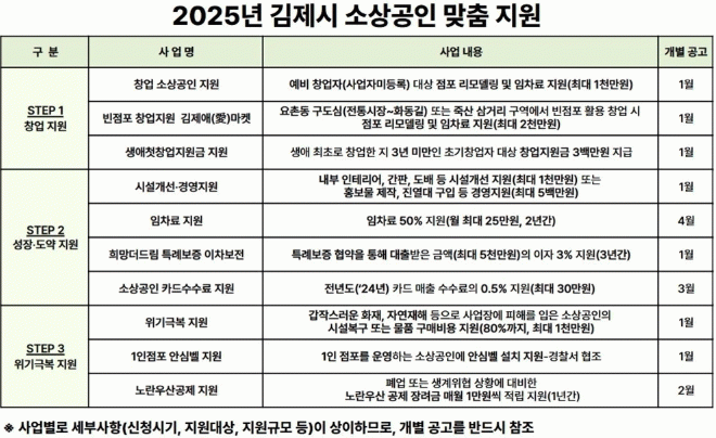 시는 이와 관련해, 사업별 공고문과 신청 시기, 제출 서류 등은 ‘네이버 밴드 - [소소방] 김제시 소상공인 소통 공간’ 또는 ‘김제시청 홈페이지-분야별 정보-경제/일자리-소상공인 지원 정책’에서 실시간으로 확인할 수 있다.