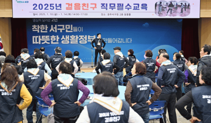 서구는 13일 ‘걸음친구’참여자 직무교육을 열어 운영 방안을 설명하고 팀별 모임을 진행했다. 김이강 서구청장은 이날 ‘걸어서 100세까지’라는 특강을 통해 걷기과 건강수명의 중요성을 강조했다.