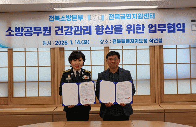 [클릭뉴스]전북특별자치도소방본부와 전북금연지원센터는 14일 도청 17층 작전실에서 금연 환경 조성과 건강 증진을 위한 업무협약(MOU)을 체결했다.