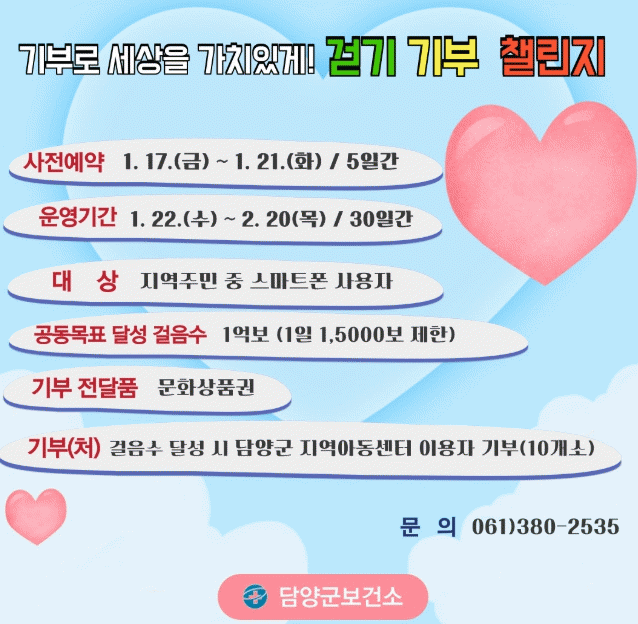 군 관계자는 “앞으로도 다양한 주제의 걷기 챌린지를 운영해 군민의 건강 향상은 물론 지역민과 함께 나눔을 실천하는 따뜻한 지역사회 분위기 조성에도 이바지하겠다”라고 전했다.