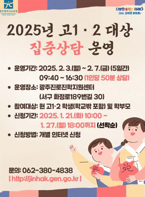 상담을 희망하는 학생은 오는 21일 오전 10시부터 27일 오후 6시까지 광주진로진학지원센터 홈페이지에서 신청하면 된다.