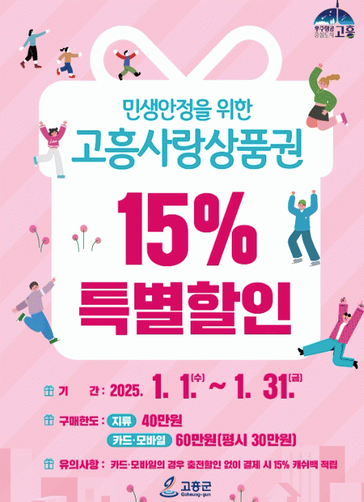 군은 다가오는 설 명절을 맞아 가계 부담을 덜고 경기침체로 어려움을 겪고 있는 소상공인을 지원하기 위해 1월 한 달간 ‘민생 안정 고흥사랑상품권 15% 특별할인’을 진행하고 있다.