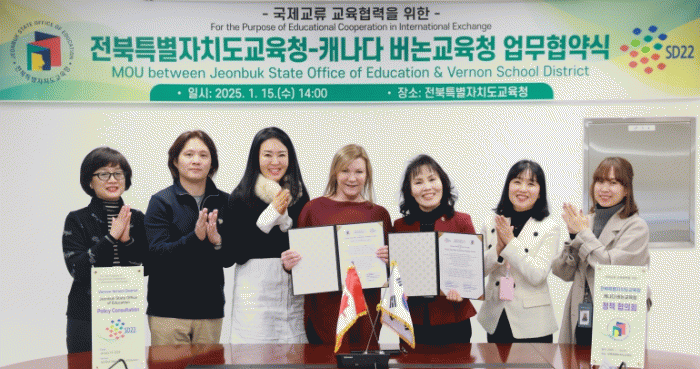 전북교육청은 15일 5층 소회의실에서 서거석 교육감과 트레이시 갓프리 캐나다 버논교육청 국제교육부장 등 양 기관 관계자 10여 명이 참석한 가운데 업무협약을 체결했다.