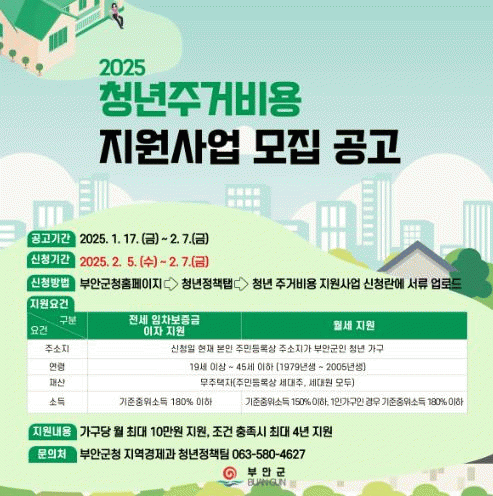 부안군 관계자는 “청년 주거비용 지원사업은 고향사랑기금으로 재원을 마련하여 추진하고 있으며, 이를 통해 더 많은 청년들이 주거비 걱정을 덜고 우리군에 안정적으로 정착할 수 있도록 적극 지원 하겠다.”고 전했다.