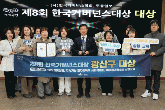 광산구는 지속가능 일자리특구 조성을 위한 시민참여형 사회적 대화, 전국 최초로 추진한 ‘1313 이웃살핌’, 이주배경 청소년 상생 교육이 높은 평가를 받아 거버넌스 분야 대상에 선정됐다.