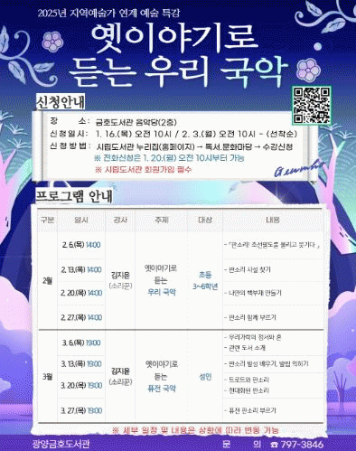 김미라 도서관과장은 “민족의 대명절 설을 맞이해 국악의 아름다움을 전하고 전통 음악에 대한 관심을 높일 계획이다”며 “전통과 현대가 조화를 이루는 특별한 수업에 많은 참여를 부탁드린다”고 말했다.
