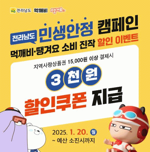 20일부터 먹깨비와 땡겨요 앱에서 지역사랑상품권으로 1만 5천 원 이상 결제 시 3천 원 상당 할인쿠폰을 받을 수 있다.