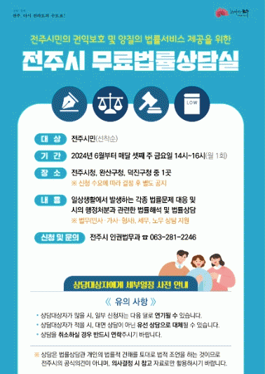 한편 무료 법률상담 서비스는 전주시민이라면 누구나 이용할 수 있으며, 상담 신청 및 문의는 전주시 인권법무과로 하면 된다.