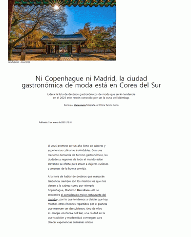 엘페리오디코는 이 기사에서 “2025년 한 해도 음식 본연의 맛은 물론 독창적인 스토리가 담긴 요리가 미식관광의 트렌드로 더욱 굳건히 잡아갈 것”이라고 분석하며, “코펜하겐, 마드리드, 바르셀로나와 같은 기존 미식도시가 아닌, 한국의 전주가 음식도시의 새로운 중심”이라고 소개했다.