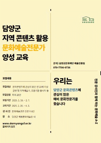 재단 문화예술 전문가 양성 과정은 담양군 지역 문화를 기반으로 문화예술전문가를 육성하기 위한 교육으로, 2월 20일부터 4월 3일까지 총 7회차 과정을 매주 목요일(1·2회차 목·금요일) 오후 5시에 진행한다.