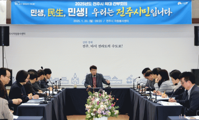 전주시는 20일 전주시자원봉사센터에서 우범기 시장과 윤동욱 부시장을 포함해 16개 실·국·소장, 과‧동장급 이상 간부공무원 148명이 참석한 가운데 ‘민생’과 ‘경제’, ‘안전’ 등을 주제로 한 확대간부회의를 개최했다.