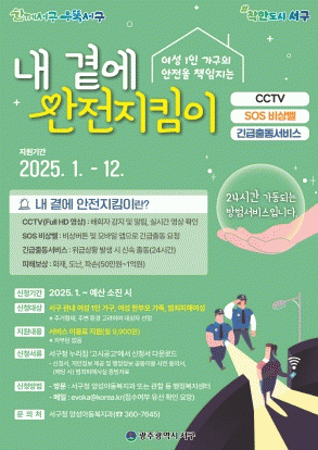 강미숙 서구 양성아동복지과장은 “안전지킴이 사업은 이용 주민들의 만족도 조사 결과 지속적으로 이용을 원한다는 응답이 압도적으로 많은 만큼 안전 체감도가 매우 높은 것으로 나타났다”며 “앞으로 호신·방범용품 추가 지원 등을 통한 여성 안전 지원을 확대하여 다함께 만들고 누리는 여성친화도시 서구 실현에 앞장서겠다”라고 말했다.