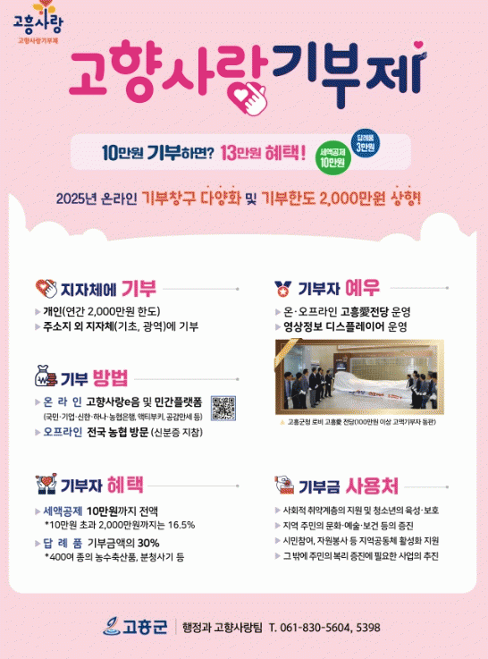 군 관계자는 “고향사랑기부제를 통해 고향에 대한 애정을 표현할 수 있는 기회를 놓치지 않기를 바란다”면서, “올해도 많은 분들이 고흥군 고향사랑기부제에 참여하여 세액공제와 답례품 혜택을 받으실 수 있도록 열심히 홍보하겠다”고 말했다.