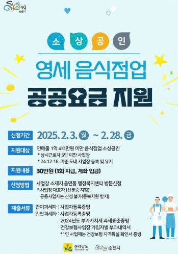 지원 대상은 2024년 12월 16일 기준 순천시에 사업장을 두고 운영 중인 음식점업 소상공인으로, 연매출 1억 4백만 원 미만이면서 상시근로자 수 5인 미만인 사업장만 해당된다.