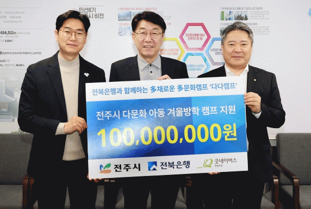 전주시와 전북은행은 22일 전주시장실에서 우범기 전주시장과 백종일 전북은행장, 오현권 전북은행 부행장, 김경환 굿네이버스 전북지역본부장 등이 참석한 가운데 전주지역 다문화 아동을 위한 ‘2025 多(다)채로운 多(다)문화캠프 다다캠프’ 지원 후원금(1억 원) 전달식을 가졌다.