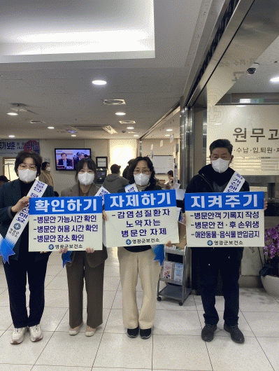 안전한 병문안 문화 개선을 위해 ▲확인하기(병문안 가능 시간, 인원, 장소)▲자제하기(감염성질환자・노약자 병문안 자제, 영상・문자・SNS로 마음 전하기)▲지켜주기(병문안객 기록지 작성 및 손위생, 애완동물・음식물 반입금지)의 병문안 3대 원칙을 홍보하며 마스크 착용 후 방문 권고 및 손씻기 등 감염병 예방수칙도 중점 홍보했다.