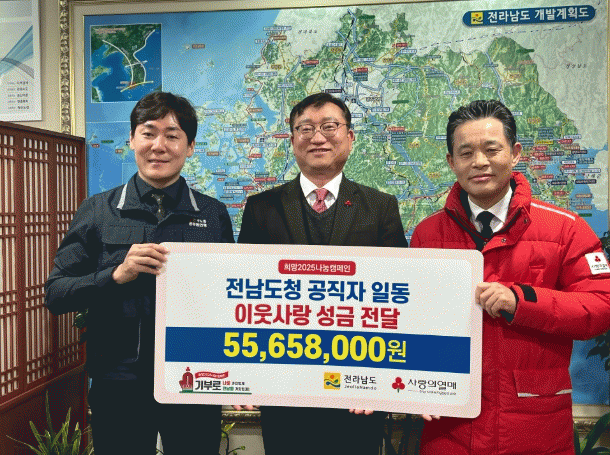 이번 성금은 지난해 12월 1일부터 12월 31일까지 전남도, 전남도의회, 소방본부 등 전남도 소속 직원들이 자발적으로 참여해 모은 것으로, 명창환 전남도 행정부지사와 이용민 노조위원장이 김동극 전남사회복지공동모금회 사무처장에게 모금액을 전달했다.