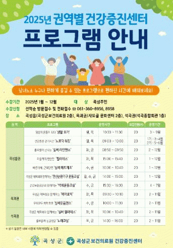 신청 방법은 곡성군 건강증진센터로 전화 문의하면 된다.