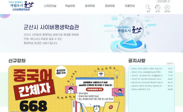 수강 신청 방법은 군산시평생학습정보망에서 회원가입 후 메인화면에 ‘사이버평생학습관 바로가기’ 또는 군산시 사이버평생학습관을 검색하여 접속하면 된다.
