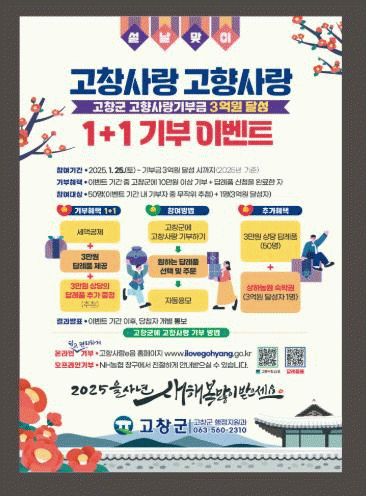 유창형 고창군 행정지원과장은 “이번 설맞이 1+1 이벤트를 통해 고향사랑기부제에 참여도 하시고 혜택도 많이 받아가시길 바란다”면서 “모금된 기금은 농산물 판매지원, 청소년 지원 사업 등 고창군의 미래를 위해 소중히 사용하겠다”고 밝혔다.