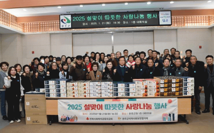 지난 21일 완주군청 1층 대회의실에서 열린 이번 설 명절 사랑나눔 행사에서는 경로당이 없는 51개 마을 및 관내 취약계층을 대상으로 곶감과 감말랭이가 전달됐다.